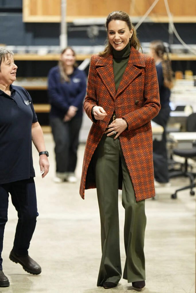 Η Kate Middleton ξεκίνησε την περιοδεία της από το ιστορικό εργοστάσιο μαλλιού Melin Tregwynt στο Pembrokeshire, το οποίο λειτουργεί συνεχώς από το 1841. Για την εμφάνισή της επέλεξε ένα κομψό παλτό εμπνευσμένο από τα χρώματα της ουαλικής σημαίας, τιμώντας με αυτόν τον τρόπο την τοπική πολιτιστική κληρονομιά. Το σύνολό της συμπληρώθηκε από χακί παντελόνι της χειμερινής συλλογής της Victoria Beckham και ένα κασμιρένιο πουλόβερ σε φυσικές, γήινες αποχρώσεις.
