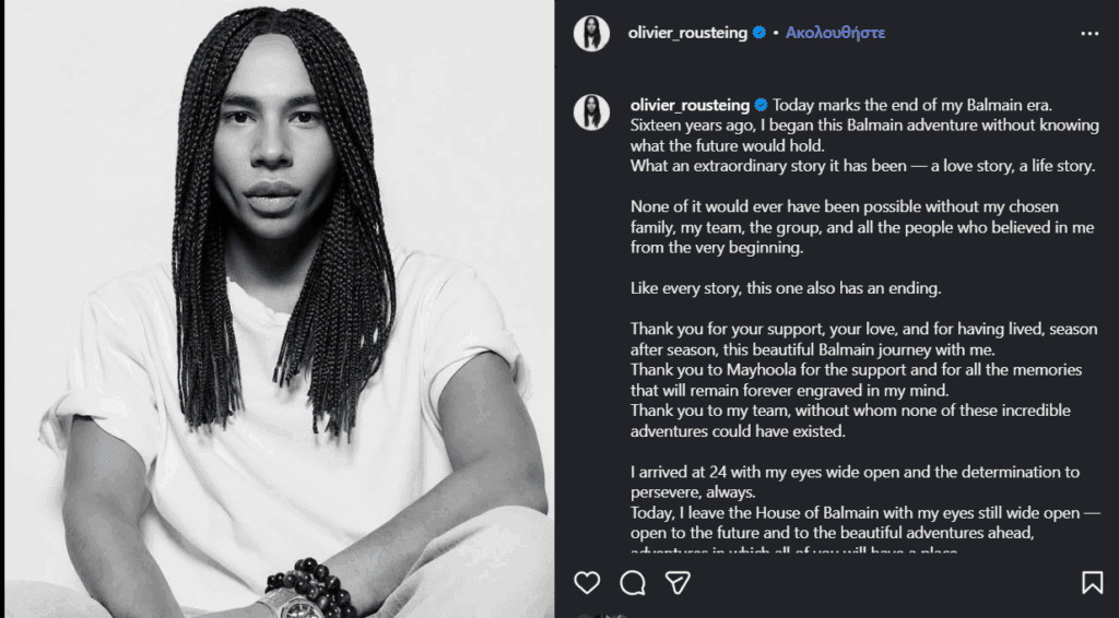 Ο Rousteing επιβεβαίωσε την είδηση με ανάρτηση στο Instagram, γράφοντας: «Σήμερα ολοκληρώνεται η εποχή μου στον Balmain. Πριν από δεκαέξι χρόνια ξεκίνησα χωρίς να ξέρω τι θα ακολουθήσει. Τι απίστευτο ταξίδι, μια ιστορία αγάπης, μια ιστορία ζωής».